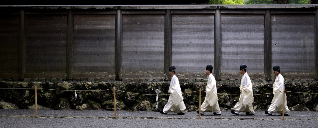 (Shinto priests walking beside the Ise Grand Shrine, Japan. Source)