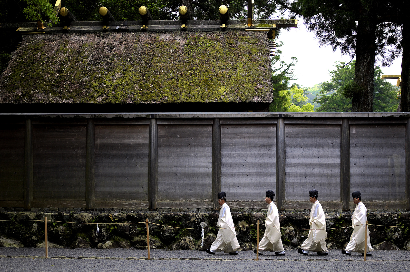 (Shinto priests walking beside the Ise Grand Shrine, Japan. Source)