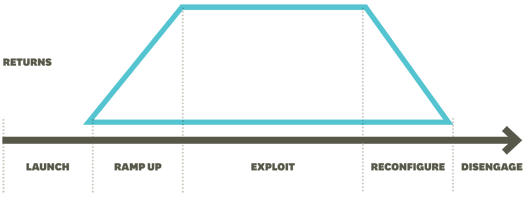 Transience as a method, an approach or a strategy is not just an expressionist arts style or some exotic charm of a shrine. It also has far reaching implications on contemporary business strategy. The June 2013 edition of Harvard Business Review features an interesting article by Rita Gunther McGrath on what she calls as Transient Advantage. She argues that in a world where competitive advantage often evaporates in less than a year, companies can’t afford to spend months at a time crafting a single long-term strategy. She introduces what she calls as The Wave of Transient Advantage and explains its ‘curve’ (below). Companies possessing this edge constantly start new strategic initiatives, build, exploit, re configure and if need be even actively disengage from an initiative as a means to reprioritise, reinvent and renew their approach to growth.